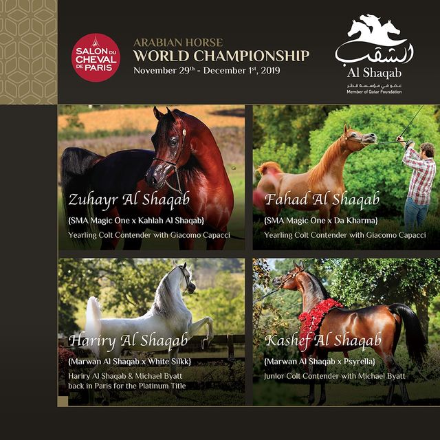 يستعد الشقب ( عضو مؤسسة قطر ) للمشاركة في بطولة العالم لجمال الخيل العربية الأصيلة التي ستقام في العاصمة الفرنسية باريس خلال الفترة من 29 نوفمبر الجاري وحتى الأول من ديسمبر بمشاركة أقوى وأفضل الجياد في العالم لاسيما وأن هذه البطولة لا يشارك فيها سوى الجياد الأبطال التي حققت ظهوراً رائعا في البطولات الدولية هذا العام