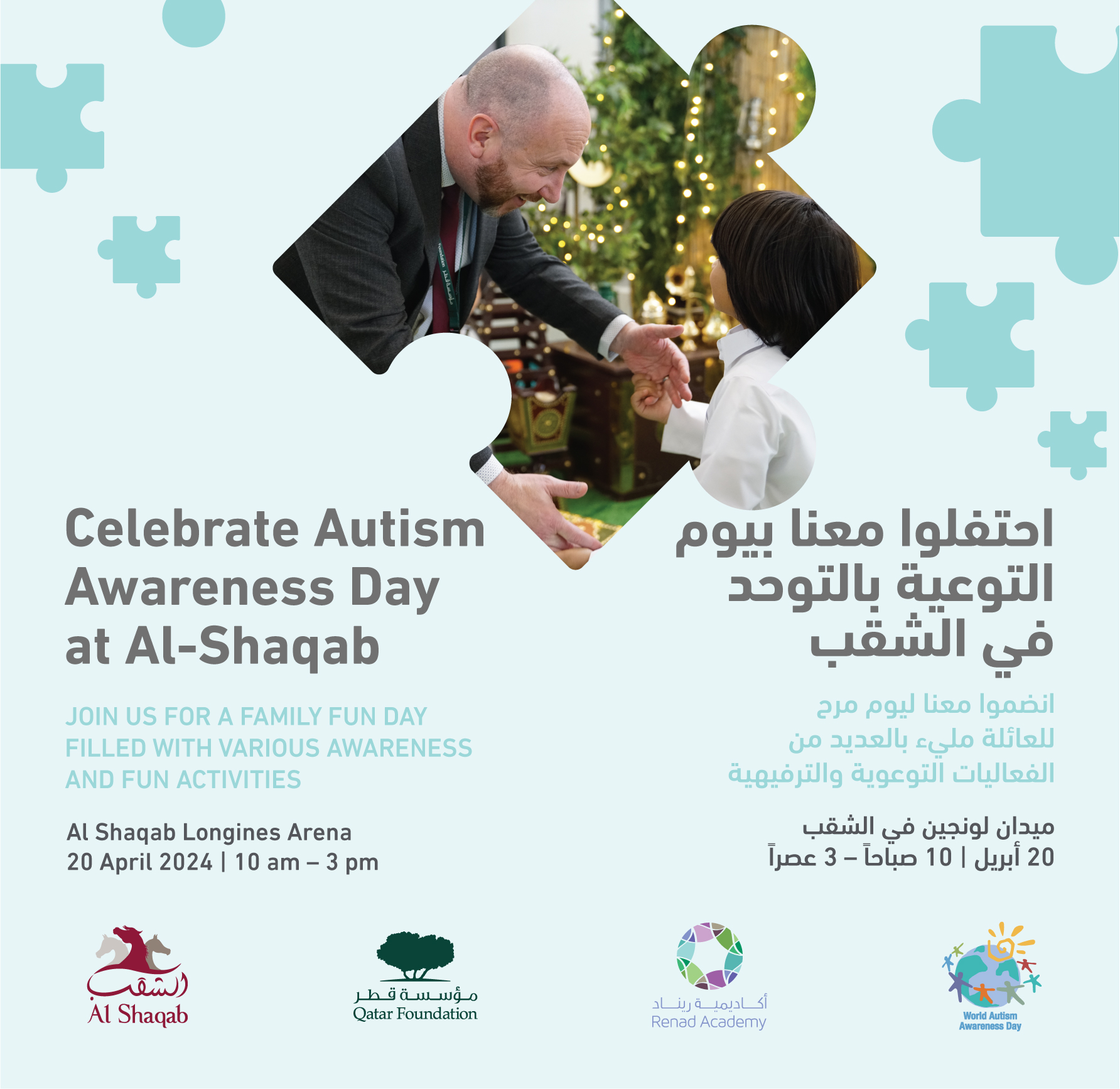 ندعوكم للانضمام إلينا في فعالية مؤسسة قطر بالتعاون مع الشقب بمناسبة اليوم العالمي للتوعية بالتوحد، الذي يُشكّل فرصةً لاحتفاء باختلافاتنا والمساهمة في بناء عالم أكثر شموليّة. تنعقد الفعالية يوم السبت الموافق 20 أبريل 2024 في تمام الساعة 10:00 صباحاً – 3:00 عصراً في ميدان لونجين في الشقب.