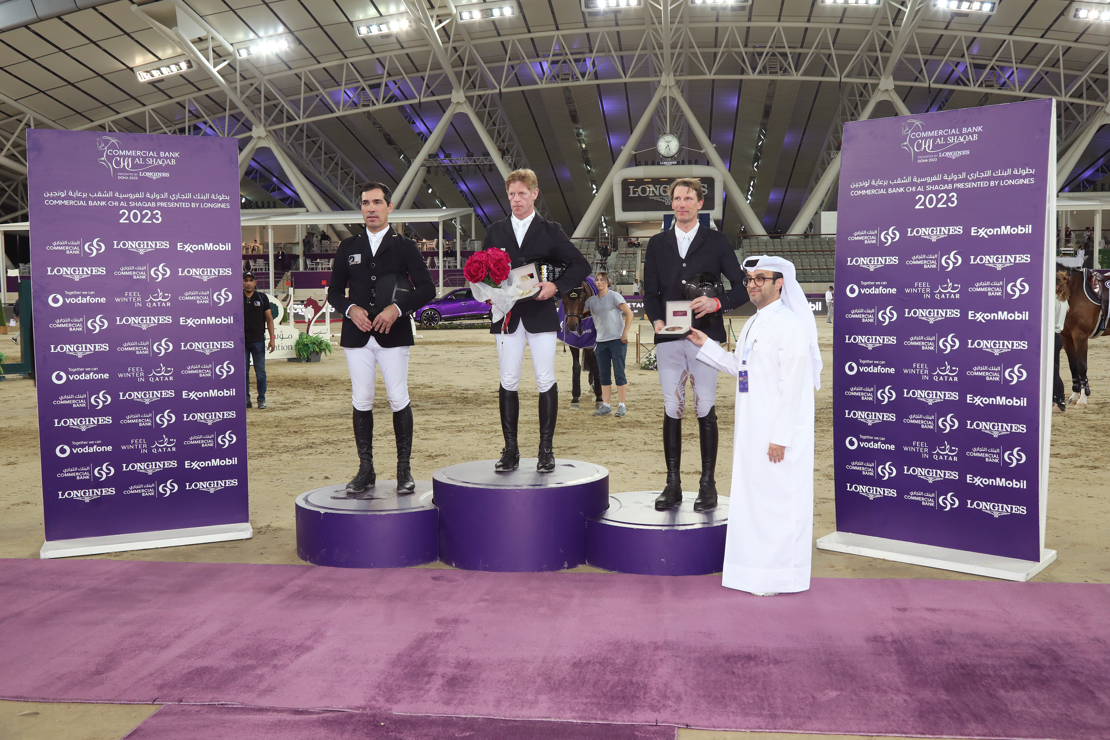 أما بخصوص منافسات قفز الحواجز (CSI 2**) بارتفاع 1.45 مترًا، حصد القطري باسم محمد المركز الأول على جواده باي ستاليون البالغ من العمر 12 عامًا، متفوقًا على صاحب المركز الثاني السعودي كمال عبد الله بهمدان الذي يركب جواده كويكلي، وفالح سويد العجمي الفائز بالمركز الثالث على الجواد غانا.